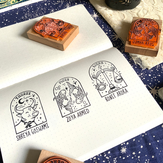 Personalised Rubber Zodiac Sign Name Stamp on a Wooden Mount